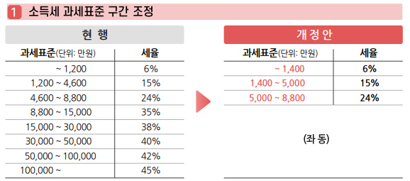 확정된 소득세법을 보면 과표 '1200만원 이하'를 '1400만원 이하'(세율 6%)로 '1200~4600만원 이하'를 '1400~5000만원 이하'(세율 15%)로 조정했다.